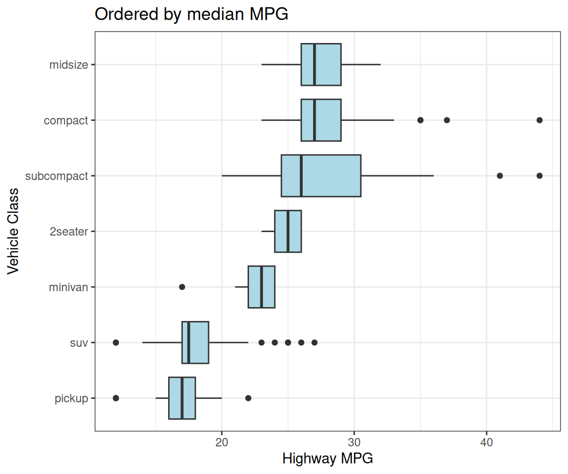 vehicle_class %>% levels()[1] "2seater" "compact" "midsize" "minivan" "pickup"