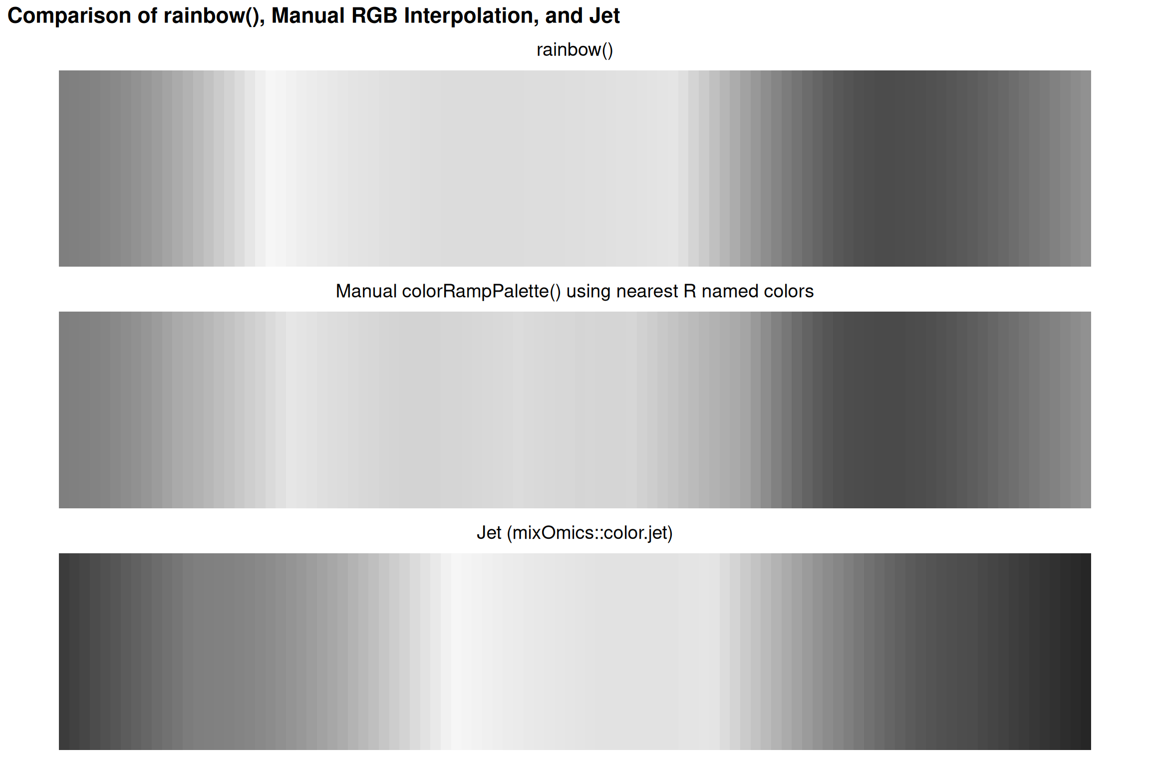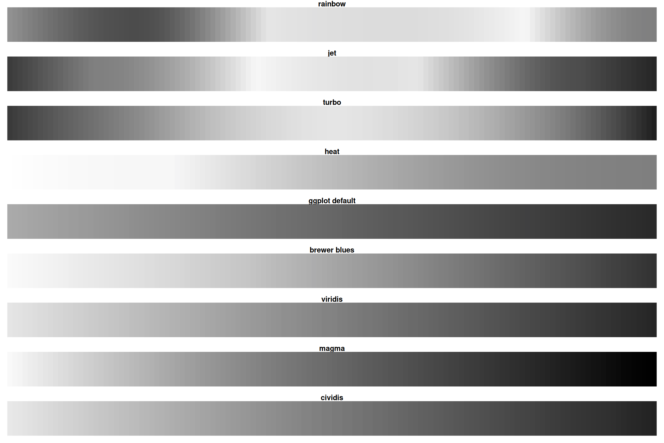 Rainbow loses all information when desaturated! Viridis/magma remain readable.