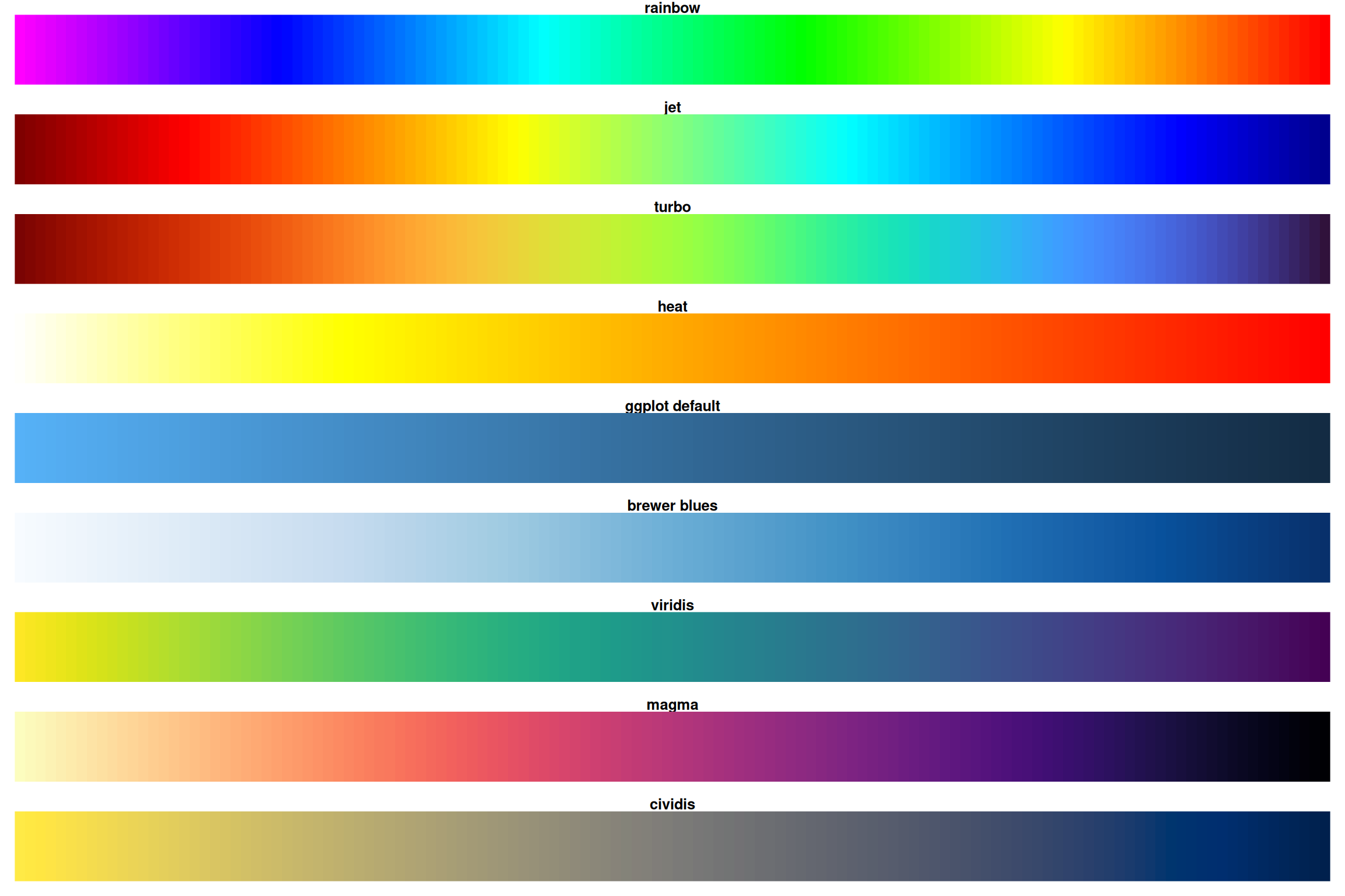 Notice how rainbow and heat have sharp transitions while viridis/magma are smooth!