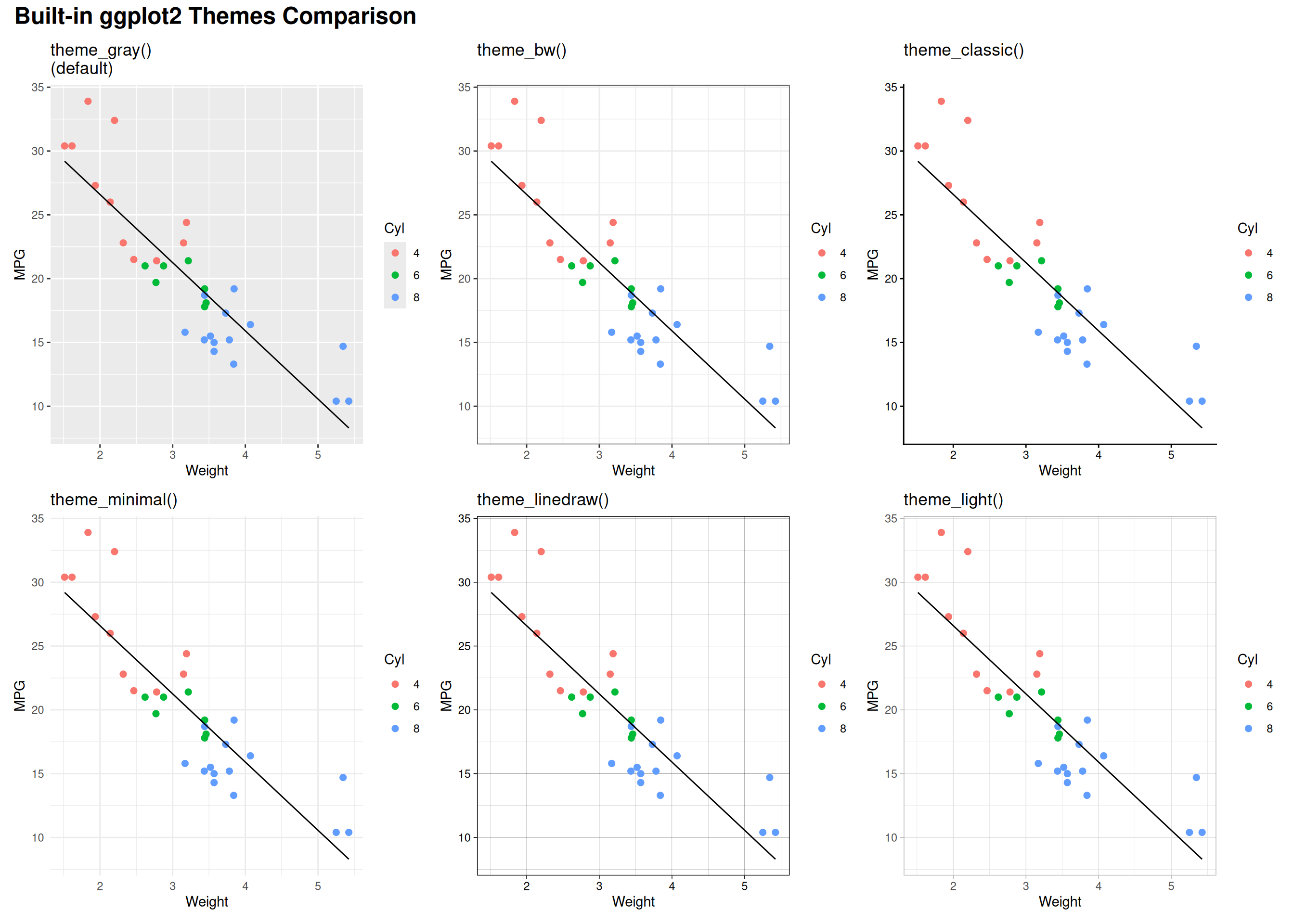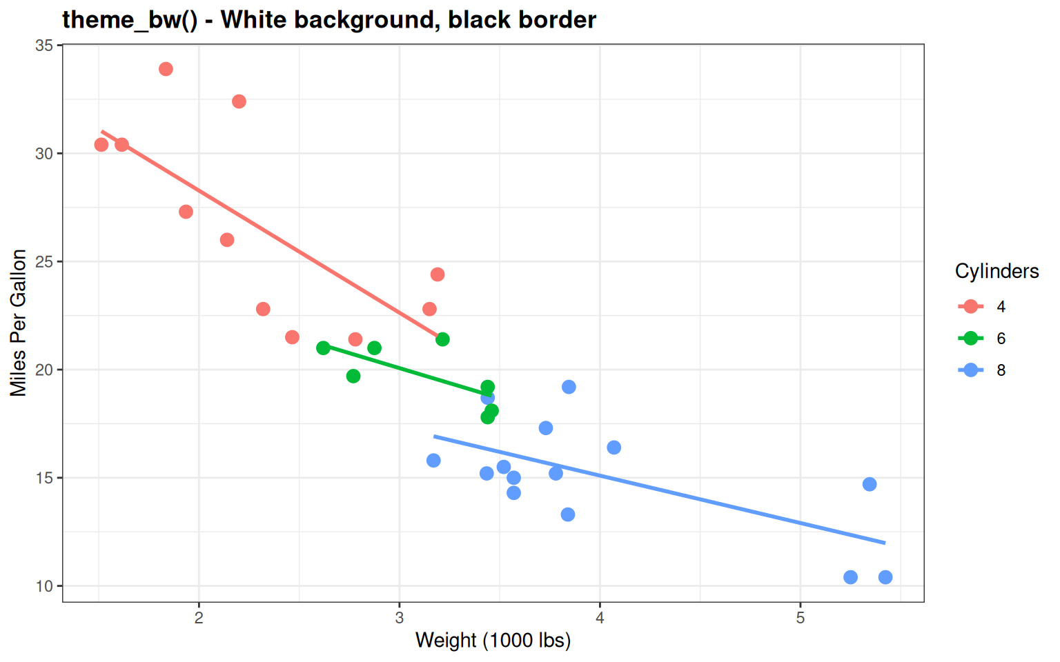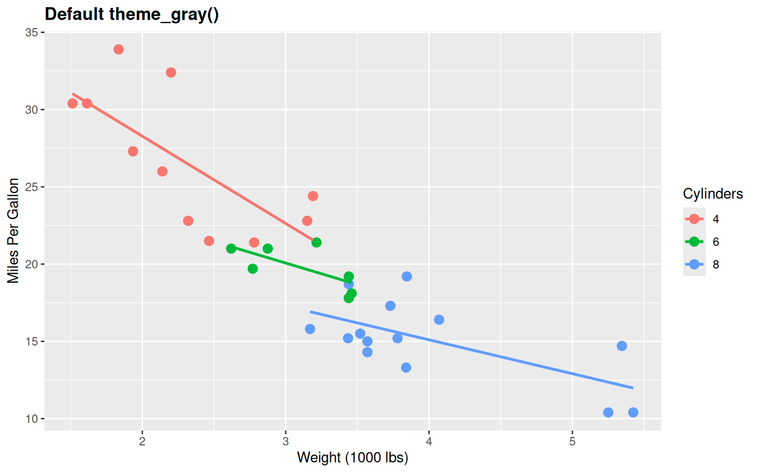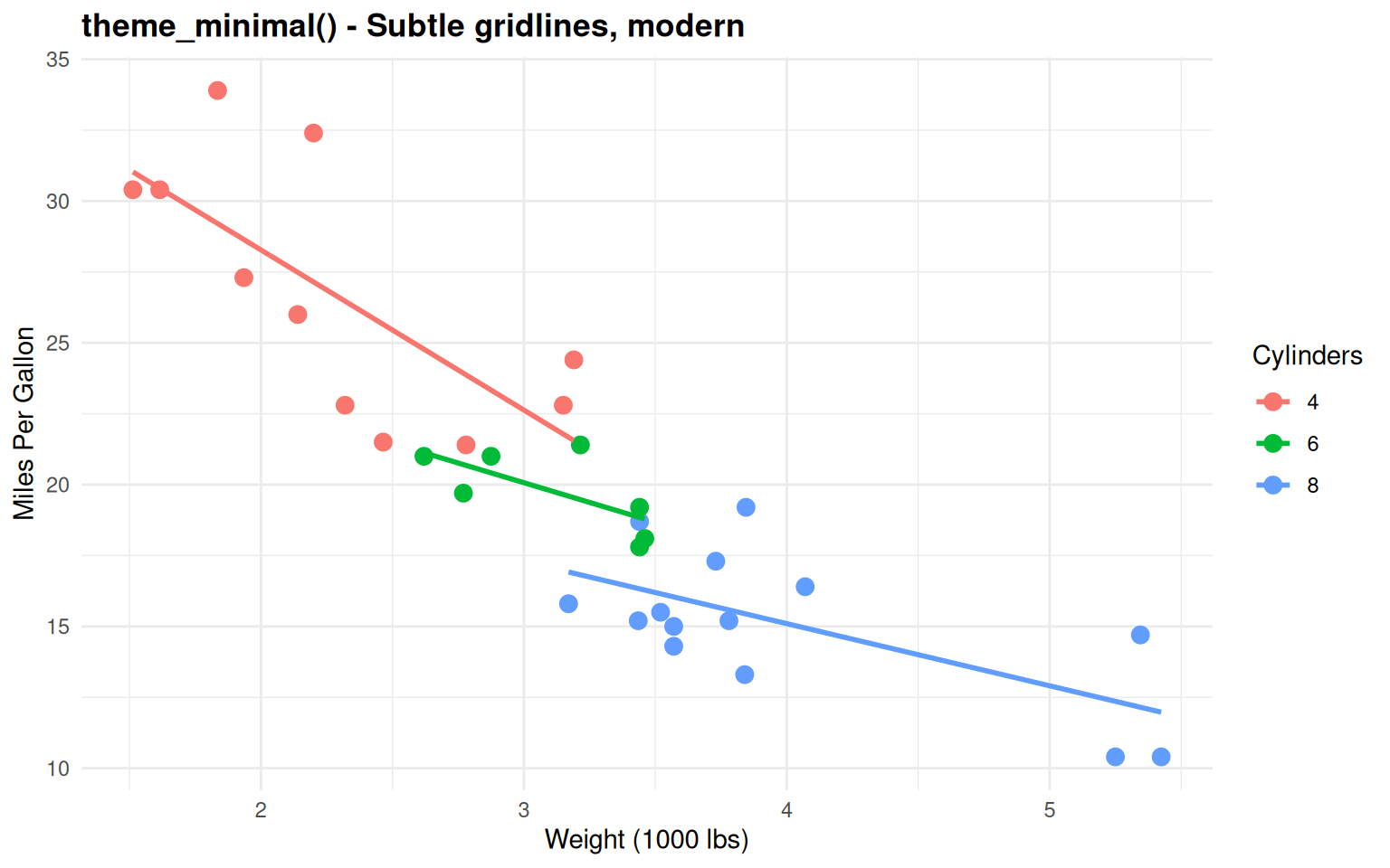 p <- ggplot(mtcars_clean, aes(wt, mpg, color = Cylinders)) +