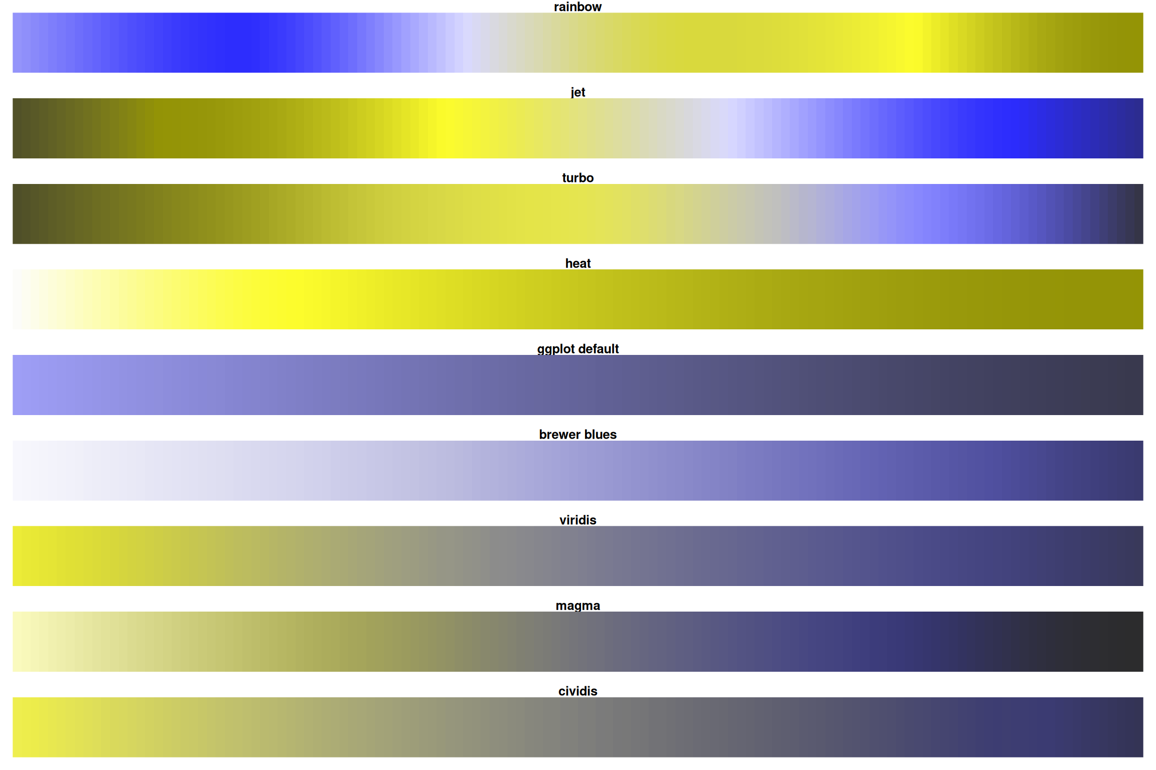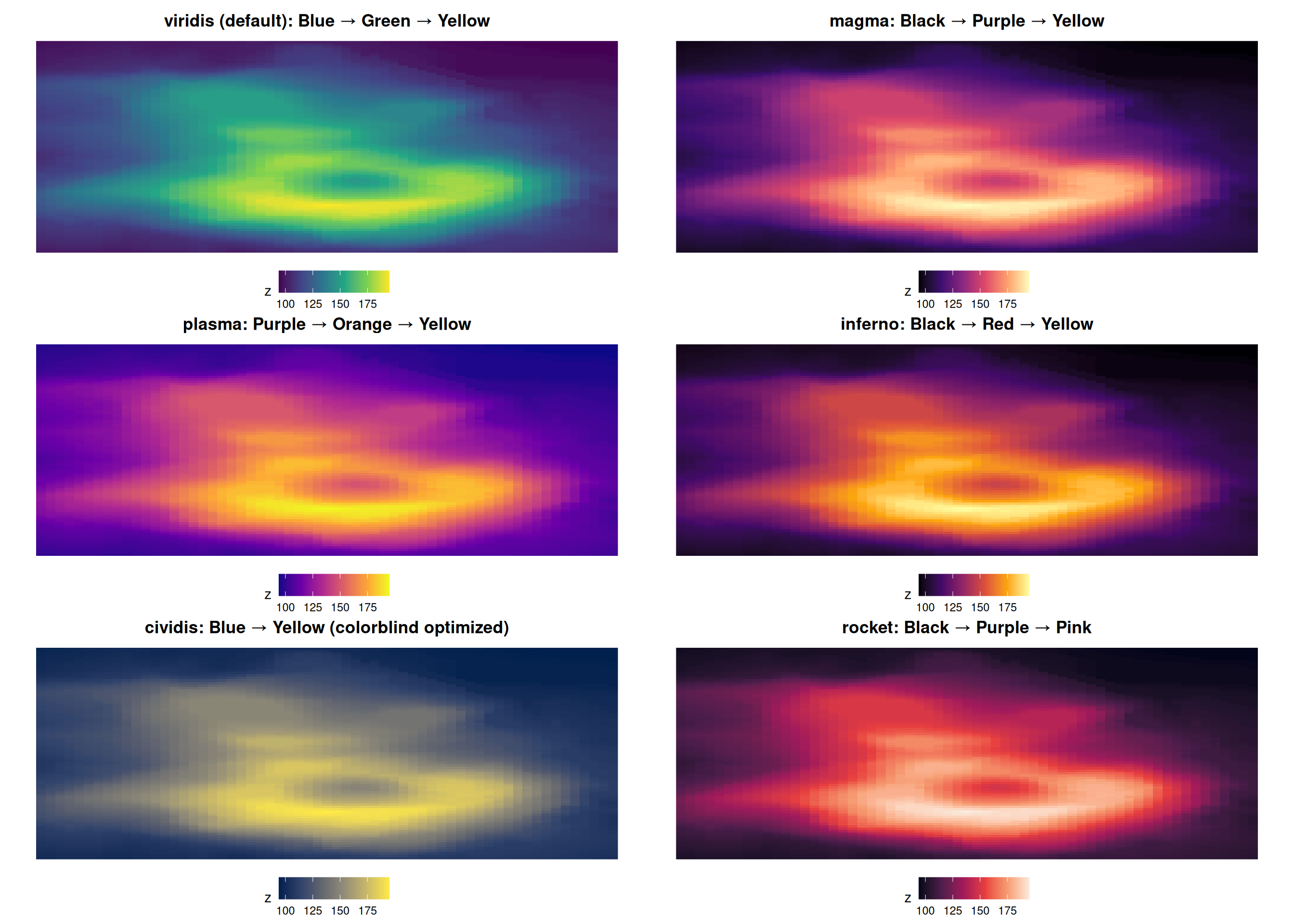 Notice how rainbow and heat have sharp transitions while viridis/magma are smooth!
