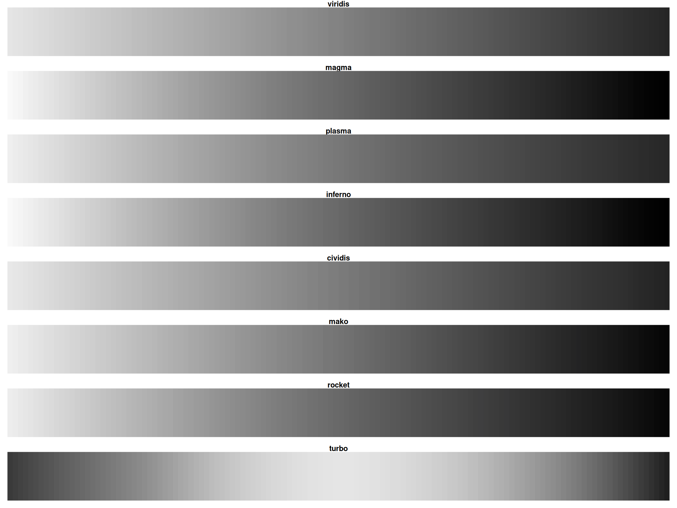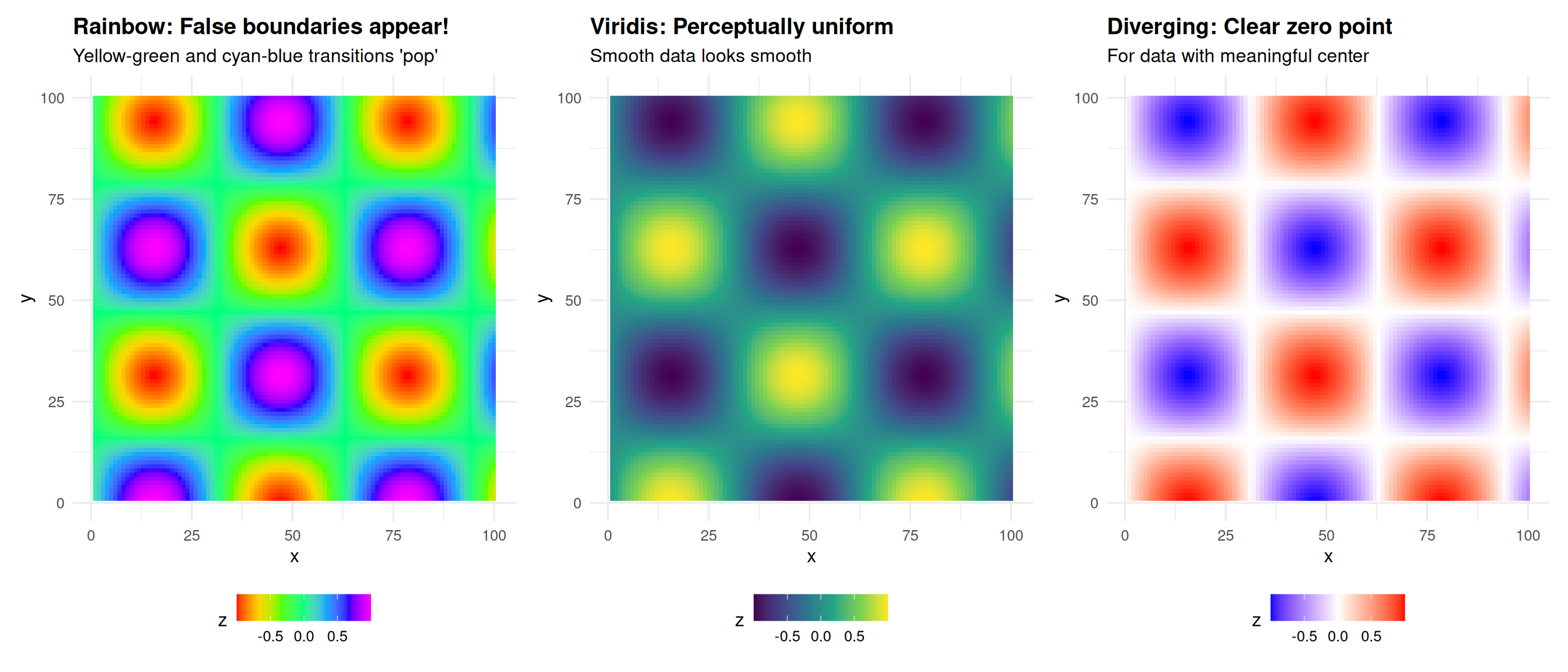 Rainbow loses all information when desaturated! Viridis/magma remain readable.