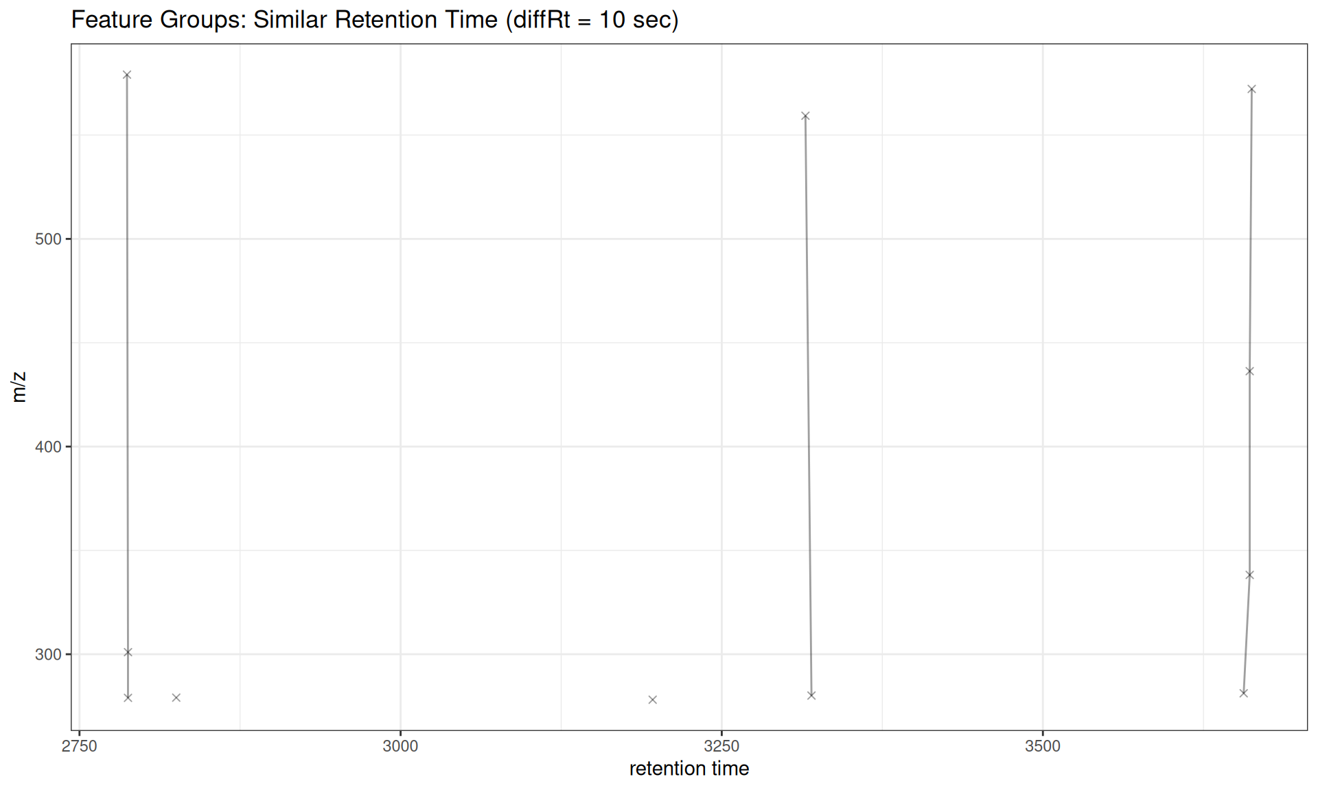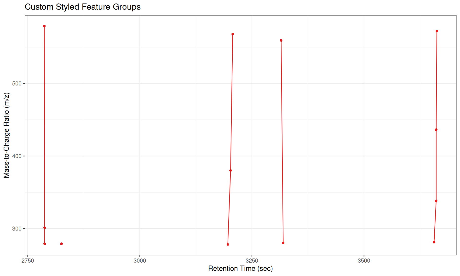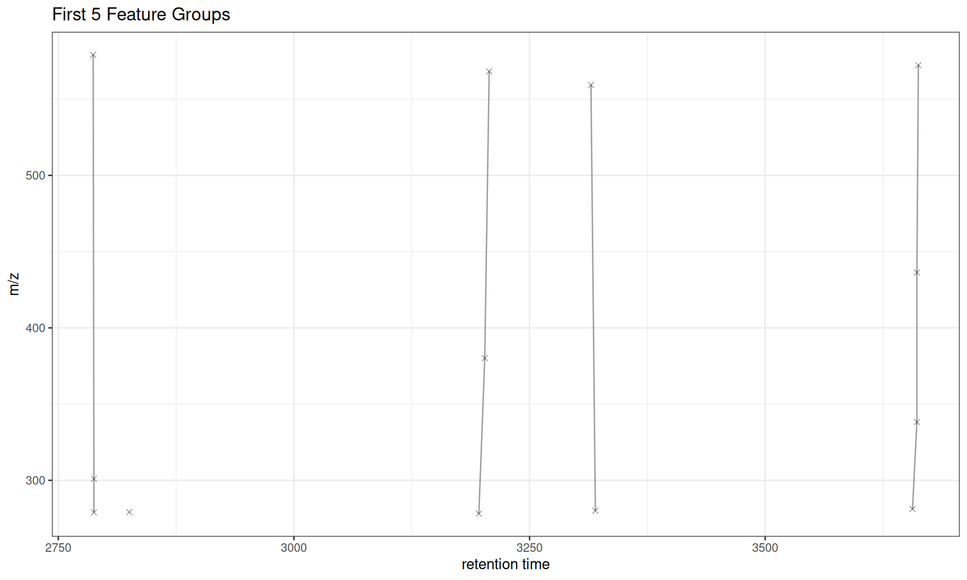 The gplotFeatureGroups() function visualizes these relationships by plotting features connected by lines within each group across retention time and m/z dimensions.