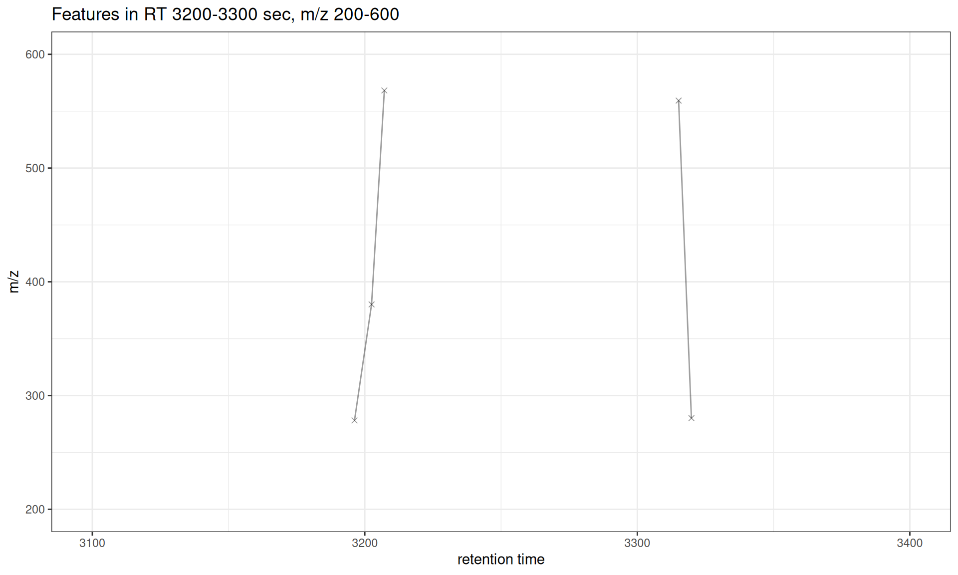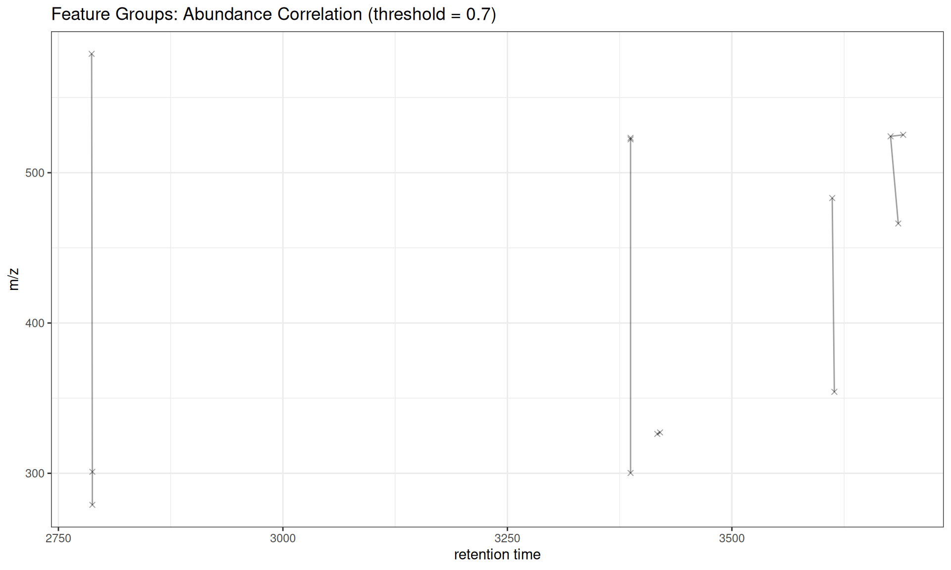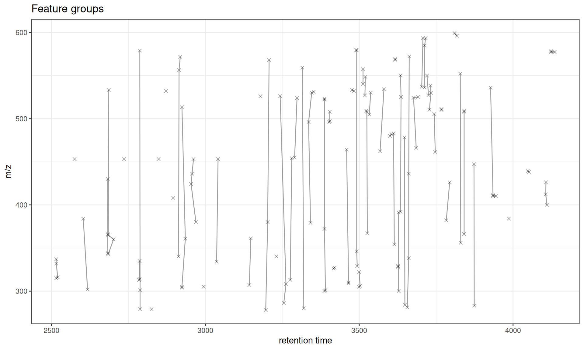 The gplotFeatureGroups() function visualizes these relationships by plotting features connected by lines within each group across retention time and m/z dimensions.