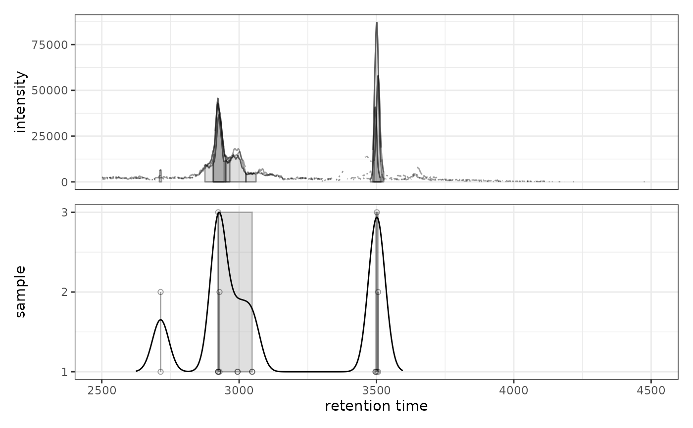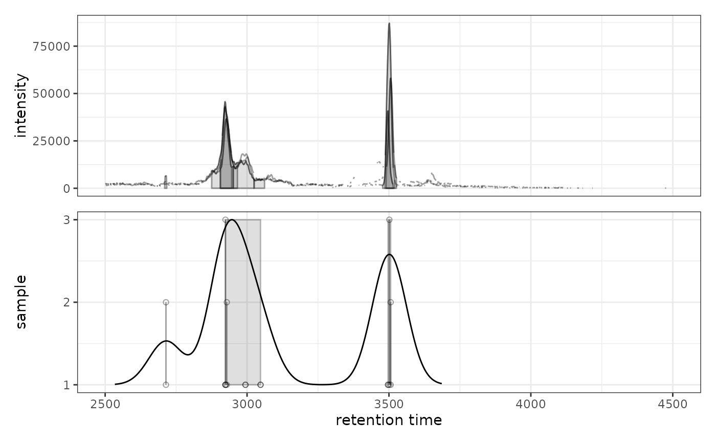 Lower panel: Peak density along retention time axis showing individual peaks as points (y-axis = sample) with density estimate overlaid as a line. Grey rectangles indicate peaks grouped into features.
