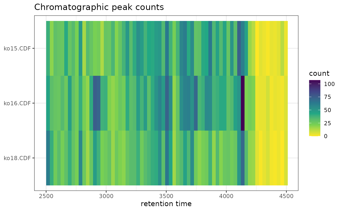 gplotChromPeakImage.RdCreates an image/heatmap showing the number of detected chromatographic